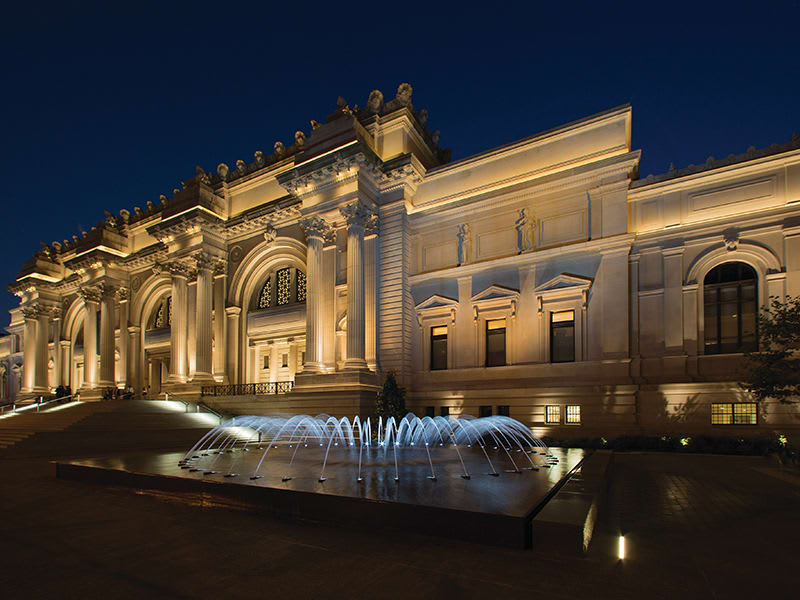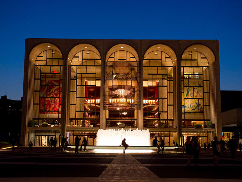 The Metropolitan Opera House at Lincoln Center Plaza, at dusk. Photo: Jonathan Tichler/Metropolitan Opera