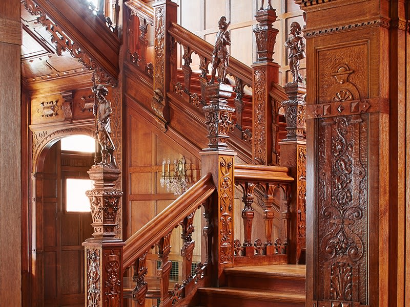 Elizabethan design influences the grand stairway, paneled in oak. Photograph: Laura Moss