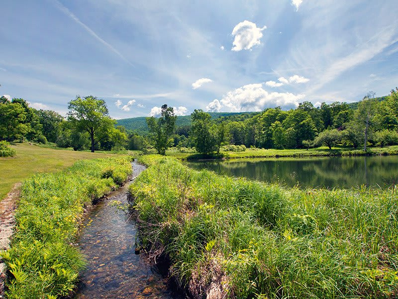 The historic 948-acre Black Hole Hollow Farm in Cambridge, New York, is located amid an idyllic landscape threaded by the White Creek brook. The estate includes barns, a riding arena, fenced paddocks, and an updated and expanded 18th-century farmhouse. On the market for $3,980,000 with LandVest, Inc.