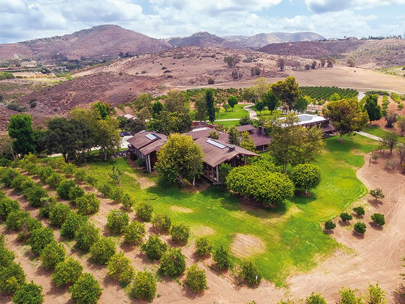 Del Dios Ranch, within Rancho Santa Fe north of San Diego, California, comprises some 210 acres. The residence is a magnificent redwood, glass, and concrete structure, and the property features a lake, tennis court, and equestrian facilities. On the market for $85,000,000 with Willis Allen Real Estate.