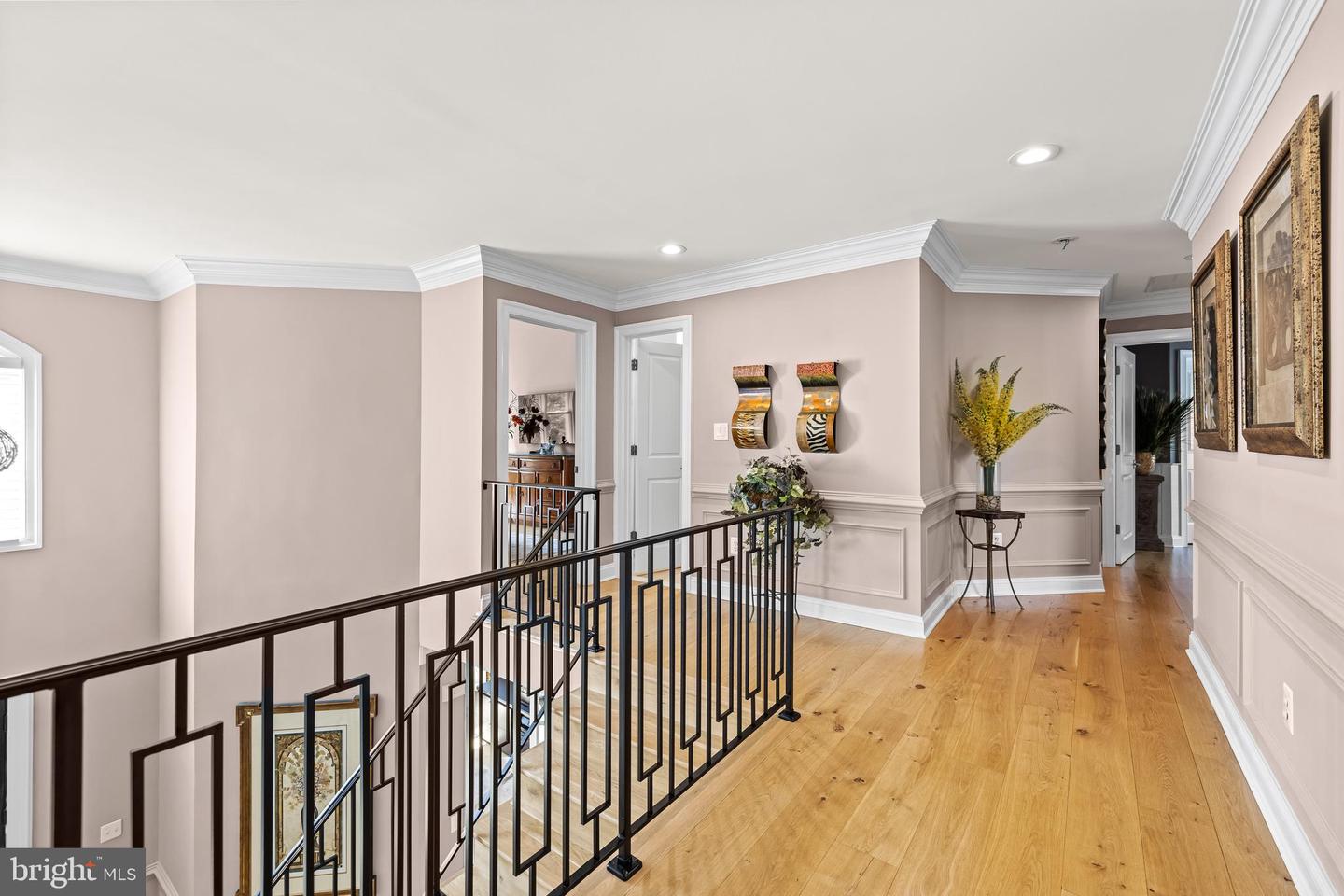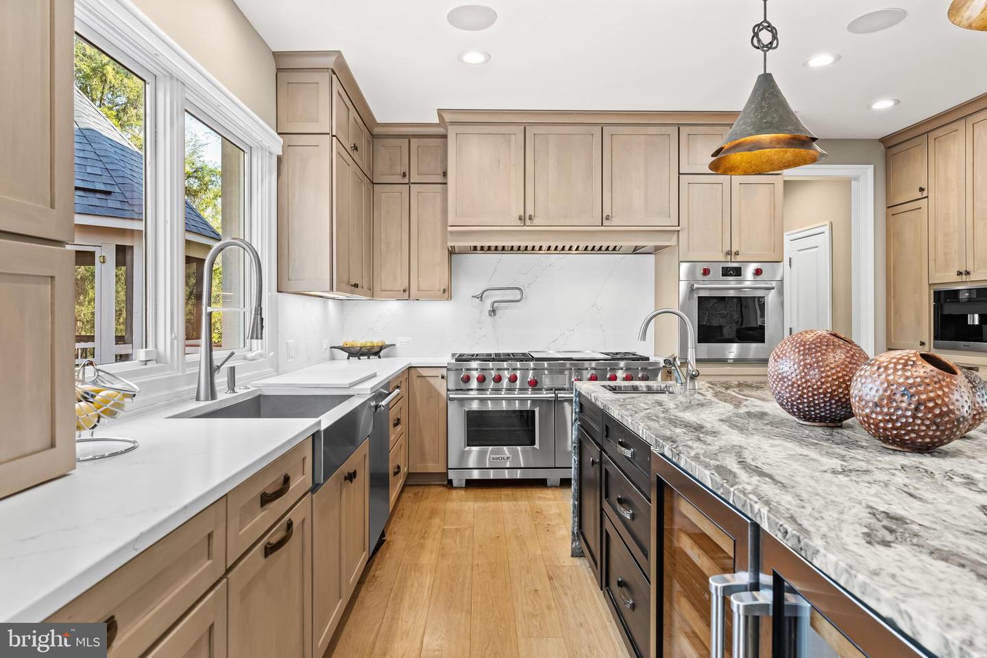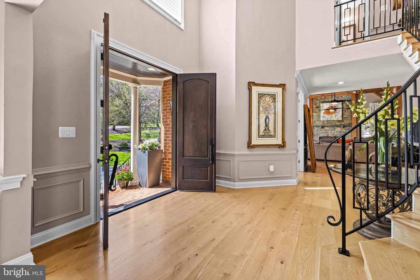Welcome to this custom-built, estate-style residence located in the prestigious Forest Glen community of Howard County. Renovated from top to bottom between 2020 and 2025, this 5-bedroom, 4 full and 2 half-bath home offers a seamless blend of timeless elegance and modern luxury, with no detail overlooked. Step inside to wide-plank, sand-in-place French white oak floors that run throughout the main level, setting the tone for the home's sophisticated finishes. A brand-new designer lighting package complements the updated Lutron lighting system, creating a warm, refined ambiance in every room. The grand great room is the true heart of the home, featuring soaring vaulted ceilings with exposed beams that frame the space with architectural drama and natural charm. The room flows effortlessly into the fully renovated gourmet kitchen, outfitted with a leathered granite waterfall island, a Wolf 6-burner gas range with integrated griddle and grill, three Wolf ovens, a warming drawer, a Miele coffee maker, a microwave, a Thermador dishwasher, and Sub-Zero refrigeration including a full-size side-by-side unit, wine cooler, and additional reach-in refrigerator.